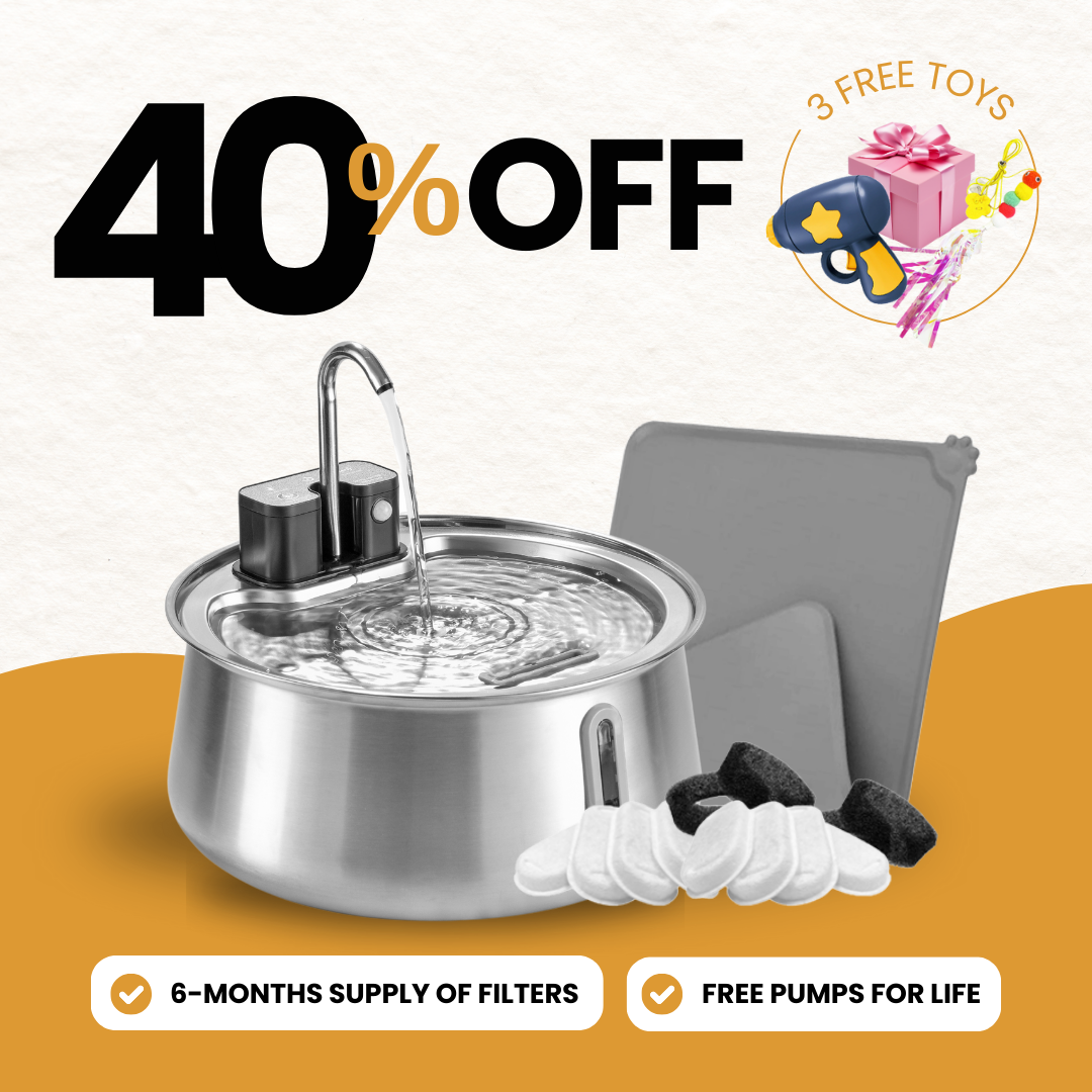 Elevate your cat's hydration and playtime. Enjoy 6 months worth of filters, no water messes, and a lifelong peace of mind with water pump replacements.
