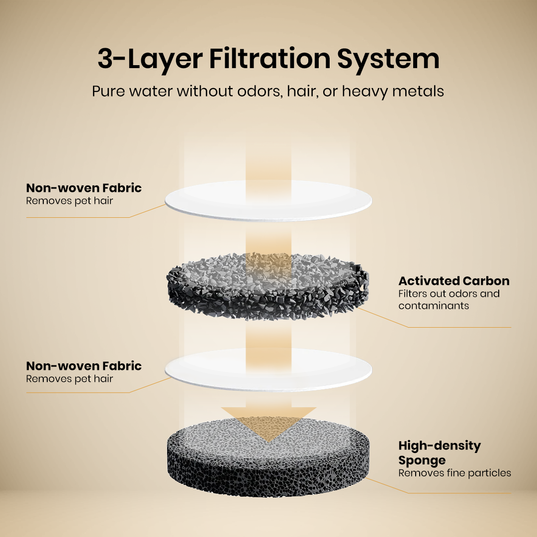 The efficient triple filtration system can effectively remove hair, heavy metals, and improve the taste of the water. Thus, your pets can drink more clean and fresh water every day and are less likely to develop urinary tract infections.