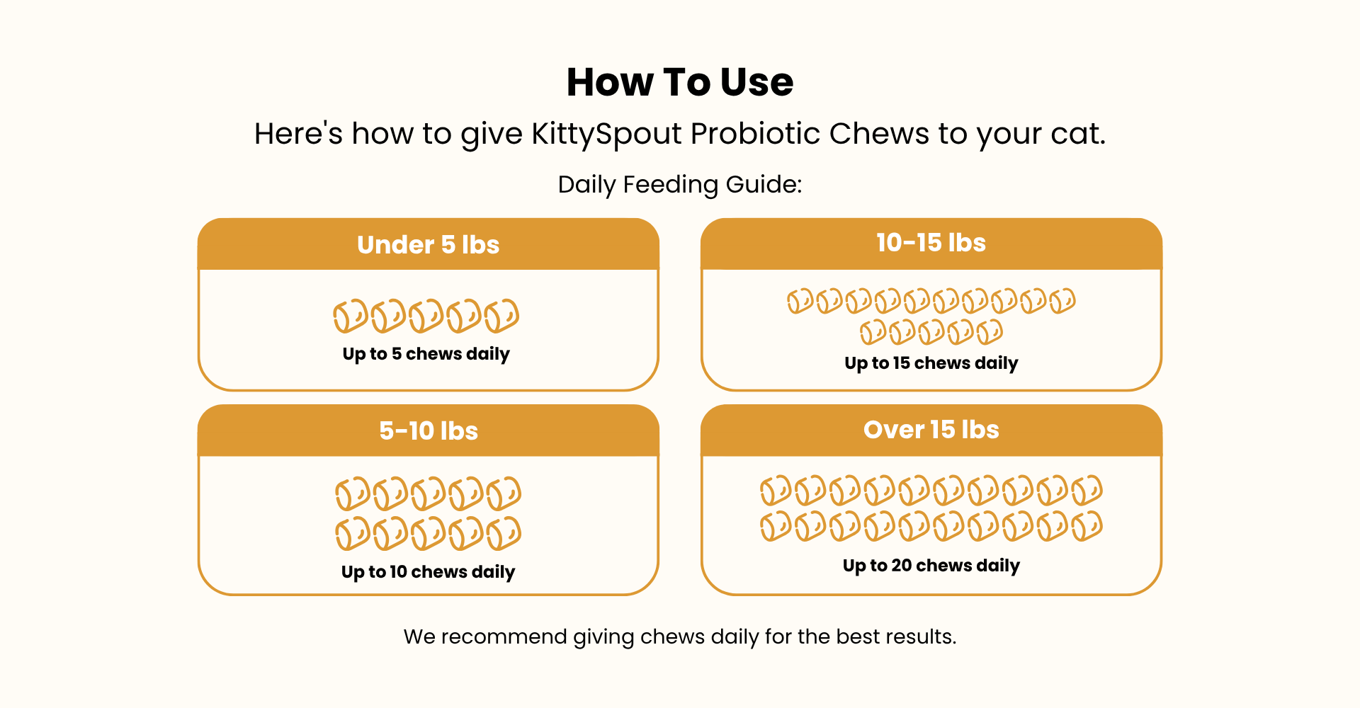 Under 5 lbs: 5 chews daily (60 servings per jar)